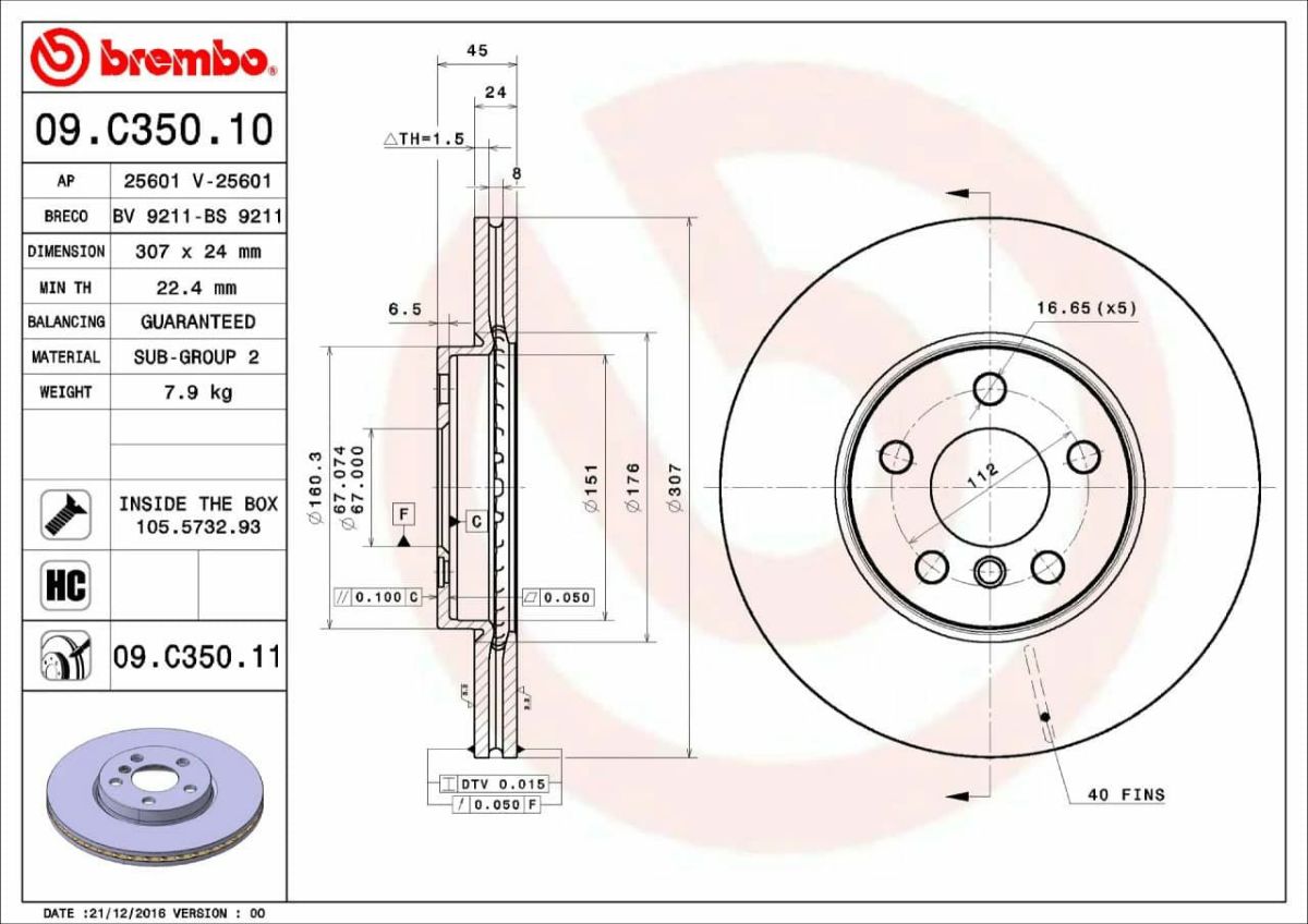 コストパフォーマンスを追求し、世界トップレベルのブレンボクオリティ 09.C350.11 ブレンボ ブレーキディスク ローター 左右セット フロント 2枚 ブレーキローター Brembo スタンダードタイプ 純正同等 ECE-R90 BMW F45 (2シリーズ ACTIVE TOURER) F46 (2シリーズ GRAN TOURER) F48 X1 ミニ クロスオーバー (F60) ミニ CLUBMAN (F54)