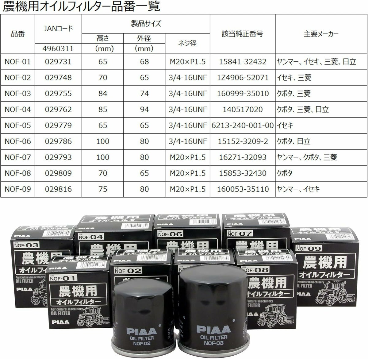 他の画像を見る PIAAブランドの農機用オイルフィルター PIAA オイルフィルター 農機用 スピンオン(カートリッジタイプ) 純正番号:160053-35110 1個入 主要メーカー:ヤンマー、イセキ NOF-09 当店特別価格 ¥ 2,301 税込 会員特別価格 ¥ 2,279 税込 カートに入れる お気に入りに登録する