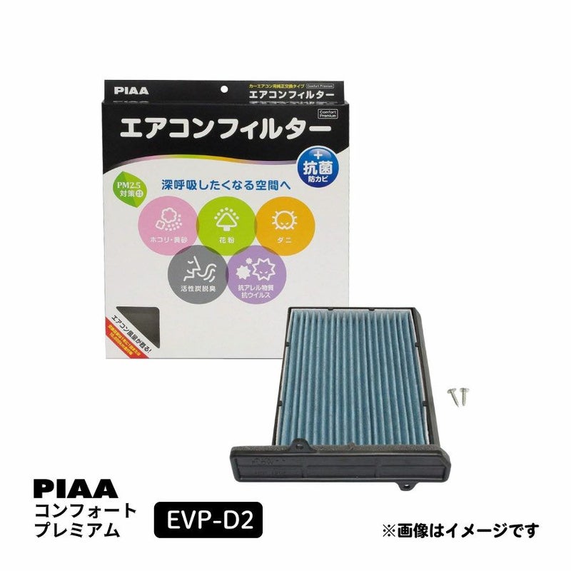 あなたの愛車を深呼吸したくなる空間へ、ホコリ・黄砂・花粉・ダニを強力キャッチ! PIAA エアコンフィルター コンフォートプレミアム 活性炭入り特殊3層フィルター(ISO 18184クリア) PM2.5対応 脱臭 抗菌 防カビ 花粉 抗ウィルスをシャットアウト ※交換用 1個入 [ダイハツ車用] タント ミラ ムーヴ 他 EVP-D2 ピア