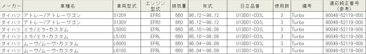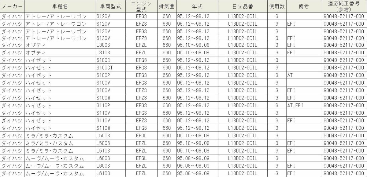 他の画像を見る 日立 HITACHI 純正品番 90048-52119-000 U13D01-COIL HITACHI 日立 イグニッションコイル 3個セット 対応車種 アトレー/アトレーワゴン ミラ/ミラ・カスタム ムーヴ/ムーヴ・カスタム 当店特別価格 ¥ 21,575 税込 会員特別価格 ¥ 21,359 税込 カートに入れる お気に入りに登録する