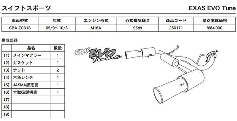 他の画像を見る 優れた排気効率と、優れた消音性能。エグザスシリーズのフラッグシップ エグザス エボチューン EXAS EVO Tune ZC31S スズキ スイフトスポーツ CBA-ZC31S 250171 | 最高品質ステンレス チタンテール GP スポーツ マフラー エキゾースト 車検対応 当店特別価格 ¥ 99,801 税込 会員特別価格 ¥ 98,804 税込 カートに入れる お気に入りに登録する