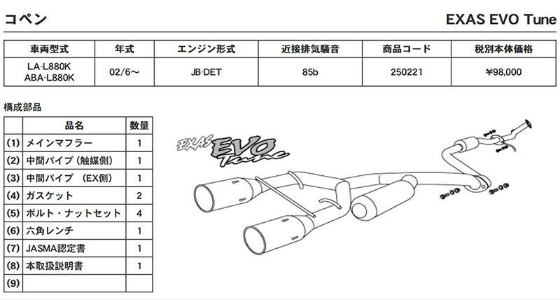 他の画像を見る 優れた排気効率と、優れた消音性能。エグザスシリーズのフラッグシップ エグザス エボチューン EXAS EVO Tune L880K ダイハツ コペン ABA-L880K / LA-L880K 250221 | 最高品質ステンレス チタンテール GP スポーツ マフラー エキゾースト 車検対応 当店特別価格 ¥ 92,409 税込 会員特別価格 ¥ 91,484 税込 カートに入れる お気に入りに登録する