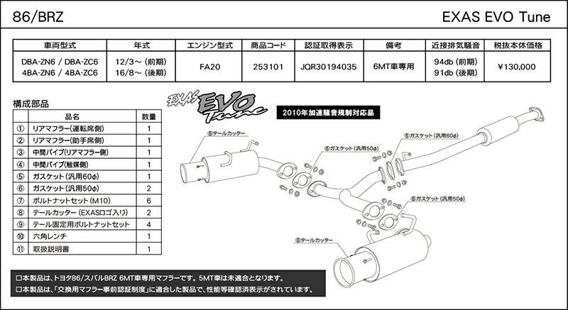 他の画像を見る 優れた排気効率と、優れた消音性能。エグザスシリーズのフラッグシップ エグザス エボチューン EXAS EVO Tune ZN6 / ZC6 / ZN8 / ZD8 ver.2 (JQR) トヨタ 86 / スバル BRZ 253101 | 最高品質ステンレス チタンテール GP スポーツ マフラー エキゾースト 車検対応 当店特別価格 ¥ 123,036 税込 会員特別価格 ¥ 121,806 税込 カートに入れる お気に入りに登録する