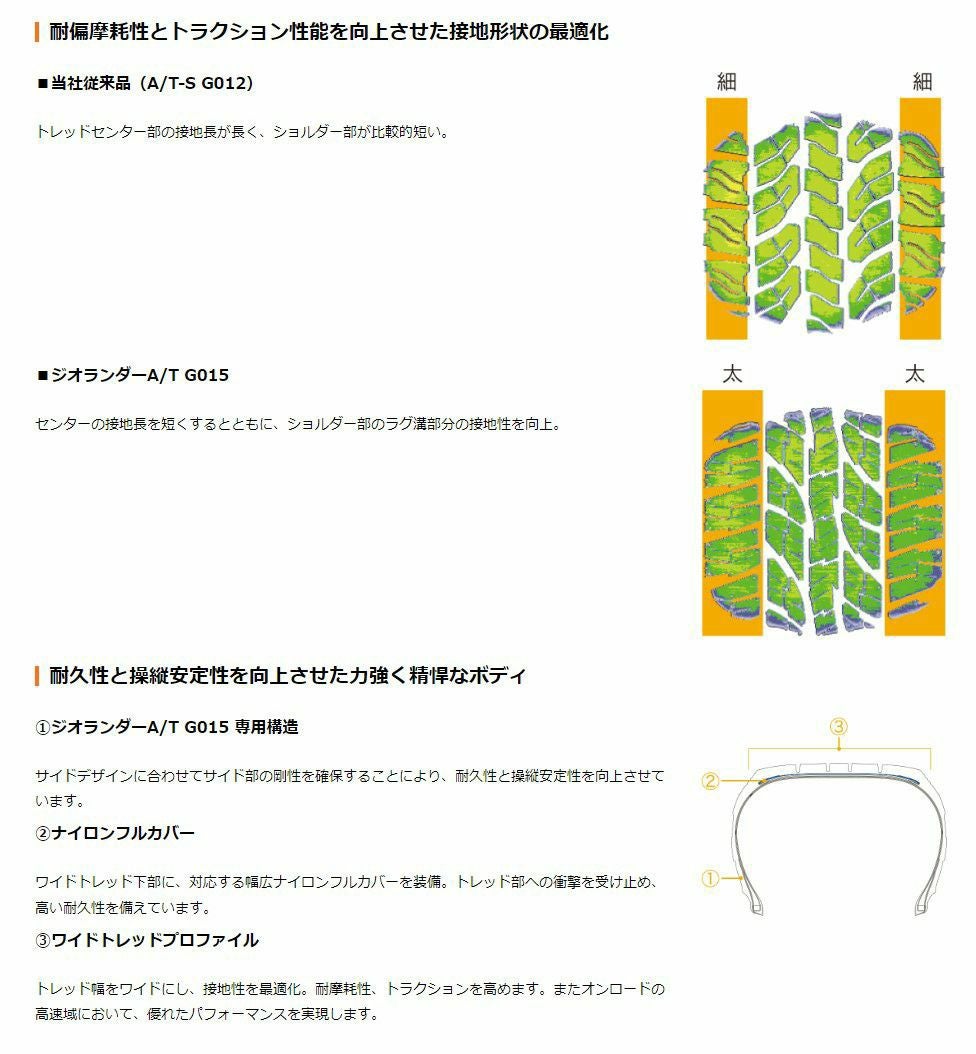 他の画像を見る オフロード性能もオンロード性能も。SUV向けオールテレーンタイヤ GEOLANDAR A/T G015 4本セット ヨコハマタイヤ GEOLANDAR A/T G015 E4524 33×12.50R15 LT 108S 15インチ SUV用 ジオランダー オフロード マッド&スノー ドレスアップ 耐摩耗性 低車外音タイヤ YOKOHAMA TIRE 当店特別価格 ¥ 74,599 税込 会員特別価格 ¥ 73,854 税込 在庫切れ 詳細を見る お気に入りに登録する