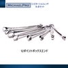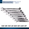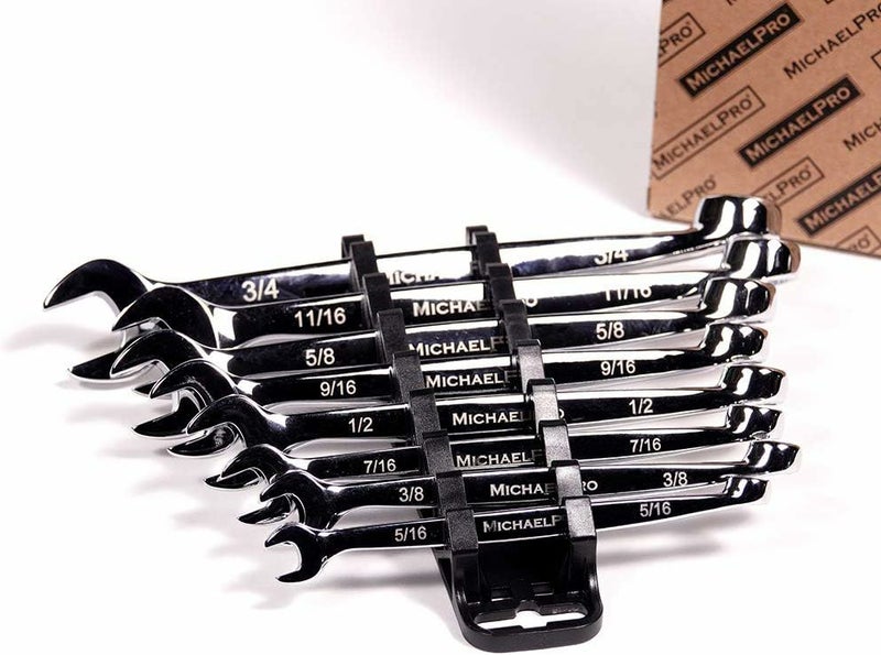 コンビネーションレンチ8点セットには、5/16インチ、3/8インチ、7/16インチ、1/2インチ、9/16インチ、5/8インチ、11/16インチ、3/4インチとさまざまな作業に対応するラックが含まれます。