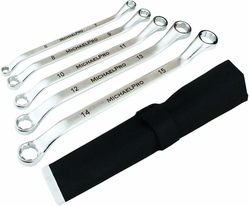 めがねレンチセット 5本セット 8×10, 12×13, 14×15, 16×17, 18×19mm 45度 脱落防止 ダブルリングスパナセット オフセットスパナ リングスパナ スワンネックリング ロールバッグ付き