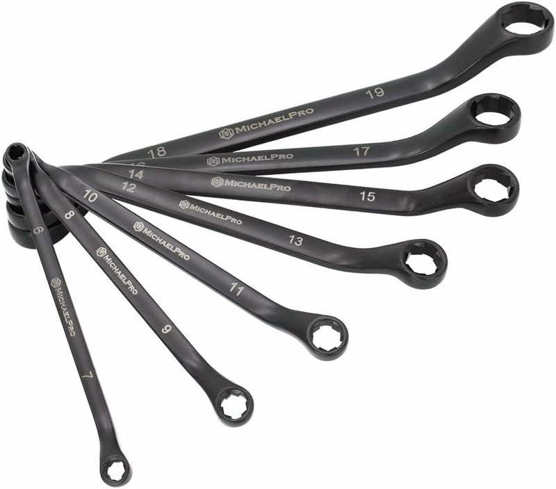 黒色酸化処理 45度噛み付き強化めがねレンチセット 7本セット 6x7, 8x9, 10x11, 12x13, 14x15, 16x17, 18x19 mm ダブルリングスパナセット ブラックオキサイドボルトエクストラクターオフセットスパナセット オフセットスパナ リングスパナ スワンネックリングスパナセット オフセットリングスパナセット