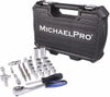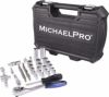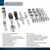 3/8 インチ Dr. 72 歯ラチェットレンチ、サイズ 10、11、12、13、14、15、16、17、18、19 mm の 3/8 インチ Dr. ソケット、サイズ 16 および 21 mm の 3/8 インチ Dr. スパーク プラグ インサート、3/8 インチ Dr. ウォブル延長ロッド (六角付き)。75 および 150 mm、3/8 インチ Dr. 延長ロッド用 3 ウェイ アダプター (3/8 インチ M x 1/2 インチ F)、3/8 インチ Dr. ユニバーサル ジョイント、サイズ 4、4.5、5、5.5、6、7、8、9 mm の 1/4 インチ Dr. ソケット