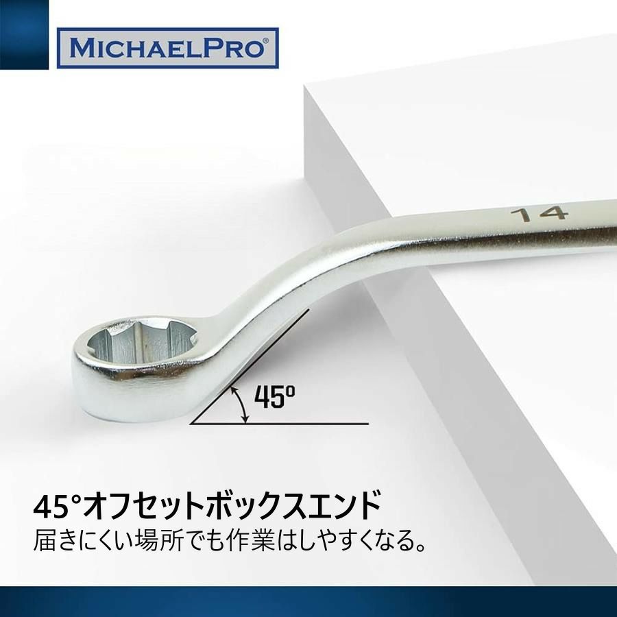 高品質のクロムバナジウム鋼で作られ、錆びにくいクロムメッキが施されたこれらのレンチ/キーは、最大限の強度と長い耐久性を実現するために熱処理されています。 めがねレンチセット 5本セット 8×10, 12×13, 14×15, 16×17, 18×19mm 45度 脱落防止 ダブルリングスパナセット オフセットスパナ リングスパナ スワンネックリング ロールバッグ付き マイケルプロ MP001034 工具 整備用品 メンテナンス 修理 DIY 自動車 MichaelPro