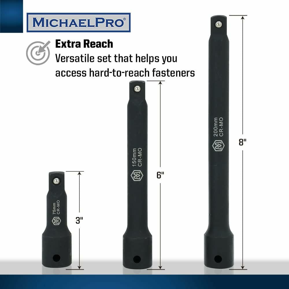 実用的な1/2インチドライブは3インチ、6インチ、8インチの長さでカバーされ、修理作業を楽にします。 1/2インチドライブ インパクトエクステンションバー 3インチ,6インチ,8インチ 熱処理済み 高耐久性 マイケルプロ MP005041 工具 整備用品 メンテナンス 修理 DIY 自動車 軽自動車 大型車 自動車やバイクの整備に MichaelPro