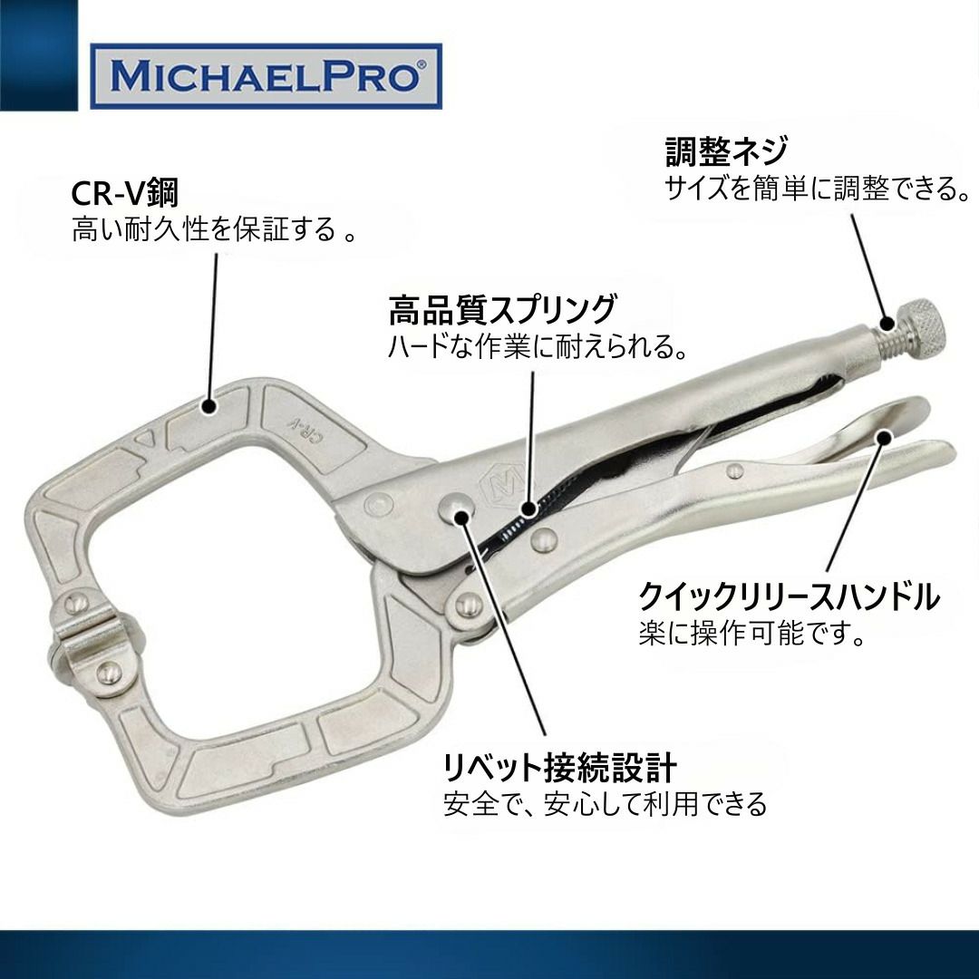 他の画像を見る 幅広のクランプジョーにより、様々なサイズに対応するユニバーサルグリップを実現。 11インチ スイベル機構付ロッキングCクランプ スイベルパッド付き マイケルプロ MP003063 工具 整備用品 メンテナンス 修理 DIY 自動車 軽自動車 大型車 自動車やバイクの整備に MichaelPro 当店特別価格 ¥ 4,114 税込 会員特別価格 ¥ 4,073 税込 カートに入れる お気に入りに登録する