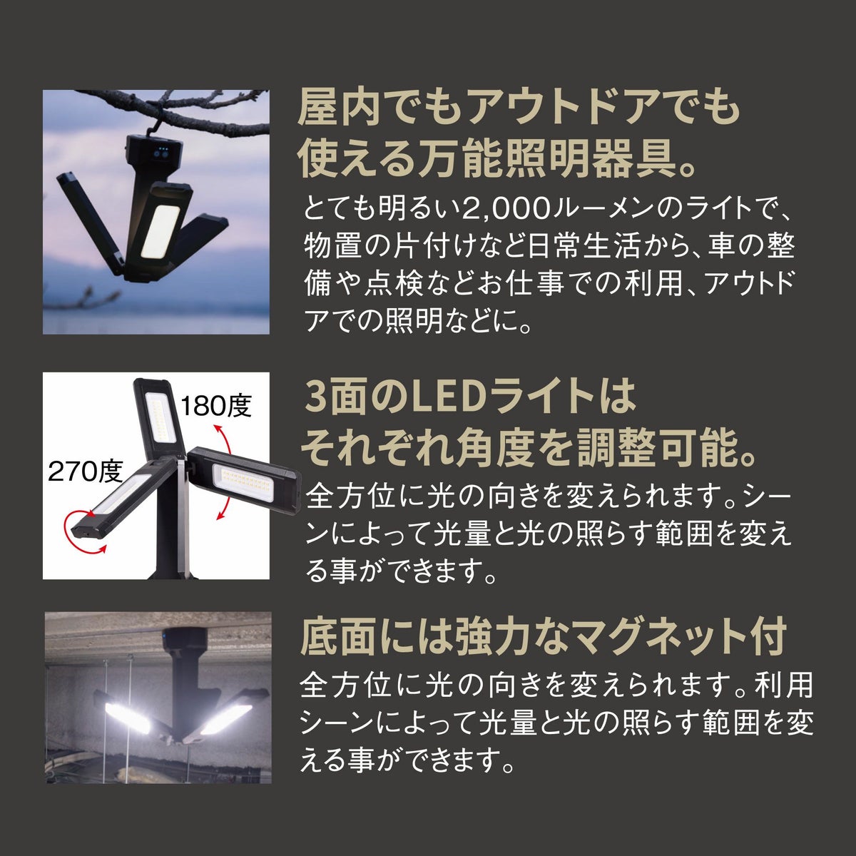 他の画像を見る 3面のLEDライトはそれぞれ角度を調整可能 スタンド付 三つ葉ライト RX-N53 ガレージ 作業 アウトドア 照明 LEDライト USB マグネット付 三脚スタンド 点検 整備 作業 当店特別価格 ¥ 12,582 税込 会員特別価格 ¥ 12,457 税込 詳細を見る お気に入りに登録する