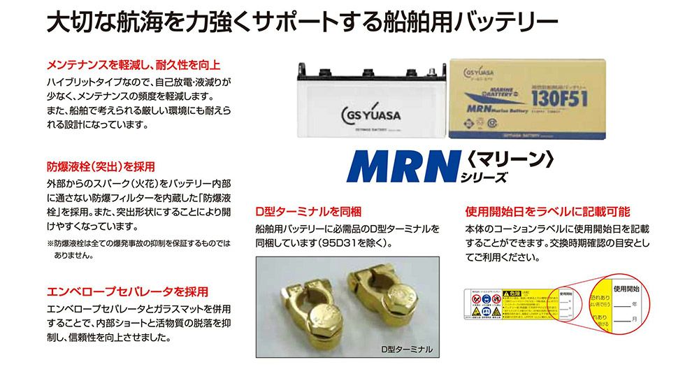 他の画像を見る GS YUASA ジーエスユアサ 船舶用高性能バッテリー MARINEシリーズ MRN-130F51 バッテリー GYB ハイブリット極板構成 ガラスマット付きエンベロープセパレータ 防爆液栓 D型ターミナルを同梱 当店特別価格 ¥ 30,621 税込 会員特別価格 ¥ 30,316 税込 詳細を見る お気に入りに登録する